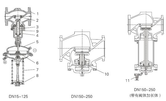 艺介质通过阀节流后,进入被控制设备,而被控设备的差压,分别引入阀的上、下膜室,在上、下膜室内产生推力,并与弹簧反力相平衡,从而确定了阀芯写阀座的相对位置,而阀芯写阀座的相对位置确定了差压值△P的大小。当被控差压变化时,力的平衡被破坏,从而带动阀芯运动,而阀当需要改变差压设定值时,可调整节螺母。