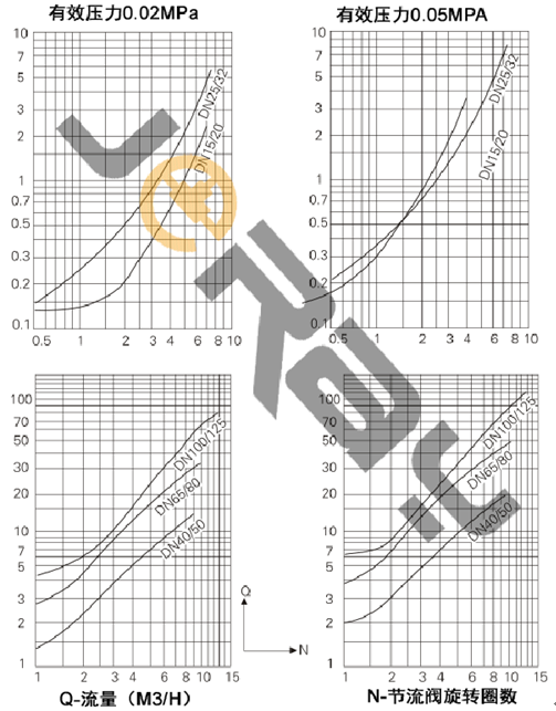 校准图:为更准确、快速调定阀的流量,提供以下校准图供用户参考(如需更精确设定或公称通径DN150~250的阀门设定流量时,采用流时计测图)笨校准图只适用于水,其它介质可参该图,并在实际汉程中进行适当调整。