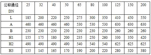 注:1、表中数据为PN16数据,其余结构外形尺寸参照ZMB、AQ/X型气动薄膜三通调节阀。