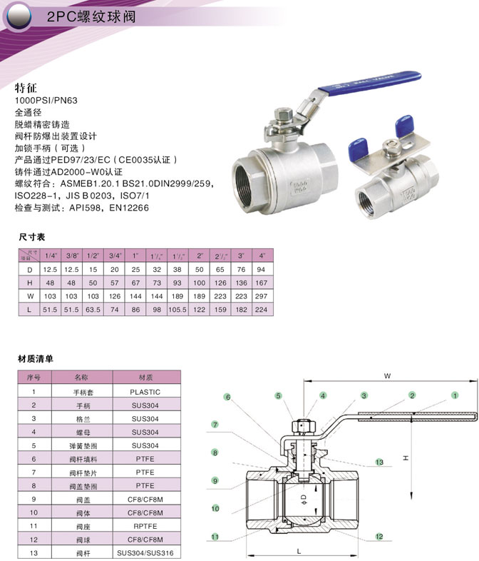 2PC螺纹球阀简单描述:全通径,双内牙设计,脱蜡精密铸造阀体,设有阀杆防爆出装置,主要用于截断或接通管路中的介质,结构紧凑,密封可靠,结构简单,维修方便,经济实惠,易于操作和维修